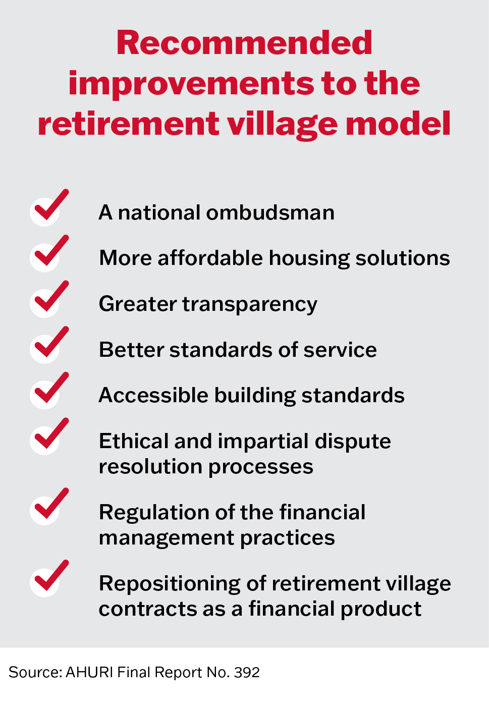 - the establishment of a national ombudsman to support and advocate for the rights of older people navigating disputes with retirement village operators